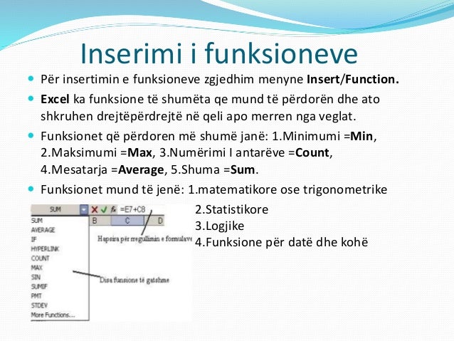 - 9. Inserimi i funksioneve Për insertimin e funksioneve zgjedhim menyne Insert/Function. Excel ka funksione të shumëta qe mund të përdorën dhe ato shkruhen drejtëpërdrejtë në qeli apo merren nga veglat. Funksionet që përdoren më shumë janë: 1.Minimumi =Min, 2.Maksimumi =Max, 3.Numërimi I antarëve =Count, 4.Mesatarja =Average, 5.Shuma =Sum. Funksionet mund të jenë: 1.matematikore ose trigonometrike 2.Statistikore 3.Logjike 4.Funksione për datë dhe kohë