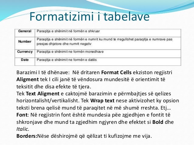 - 11. Formatizimi i tabelave Barazimi I të dhënave: Në dritaren Format Cells ekziston regjistri Aligment tek I cili janë të vëndosura mundesitë ë orientimit të teksitit dhe disa efekte të tjera. Tek Text Aligment e caktojmë barazimin e përmbajtjes së qelizes horizontalisht/vertikalisht. Tek Wrap text nese aktivizohet ky opsion teksti brena qelisë mund të paraqitet në më shumë rreshta. Etj… Font: Në regjistrin font është mundesia pëe zgjedhjen e fontit të shkronjave dhe mund ta zgjedhim ngjyren dhe efektet si Bold dhe Italic. Borders:Nëse dëshirojmë që qëlizat ti kufizojme me vija.