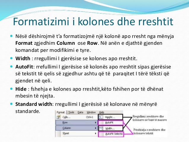 - 12. Formatizimi i kolones dhe rreshtit Nësë dëshirojmë t’a formatizojmë një kolonë apo rresht nga mënyja Format zgjedhim Column ose Row. Në anën e djathtë gjenden komandat per modifikimi e tyre. Width : rregullimi I gjerësise se kolones apo rreshtit. AutoFit: rrefullimi I gjerësise së kolonës apo rreshtit sipas gjerësise së tekstit të qelis së zgjedhur ashtu që të paraqitet I tërë tëksti që gjendet në qeli. Hide : fshehja e kolones apo rreshtit,këto fshihen por të dhënat mbesin të njejta. Standard width: rregullimi I gjerësisë së kolonave në mënyrë standarde.