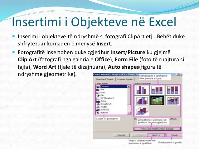 - 13. Insertimi i Objekteve në Excel Inserimi i objekteve të ndryshmë si fotografi ClipArt etj.. Bëhët duke shfrytëzuar komaden ë mënysë Insert. Fotografitë insertohen duke zgjedhur Insert/Picture ku gjejmë Clip Art (fotografi nga galeria e Office), Form File (foto të ruajtura si fajla), Word Art (fjale të dizajnuara), Auto shapes(figura të ndryshme gjeometrike).