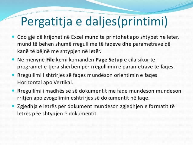 - 14. Pergatitja e daljes(printimi) Cdo gjë që krijohet në Excel mund te printohet apo shtypet ne leter, mund të bëhen shumë rregullime të faqeve dhe parametrave që kanë të bëjnë me shtypjen në letër. Në mënynë File kemi komanden Page Setup e cila sikur te programet e tjera shërbën për rrëgullimin ë parametrave të faqes. Rregullimi I shtrirjes së faqes mundëson orientimin e faqes Horizontal apo Vertikal. Rregullimi i madhësisë së dokumentit me faqe mundëson mundeson rritjen apo zvogelimin eshtrirjes së dokumentit në faqe. Zgjedhja e letrës për dokument mundeson zgjedhjen e formatit të letrës pëe shtypjën ë dokumentit.