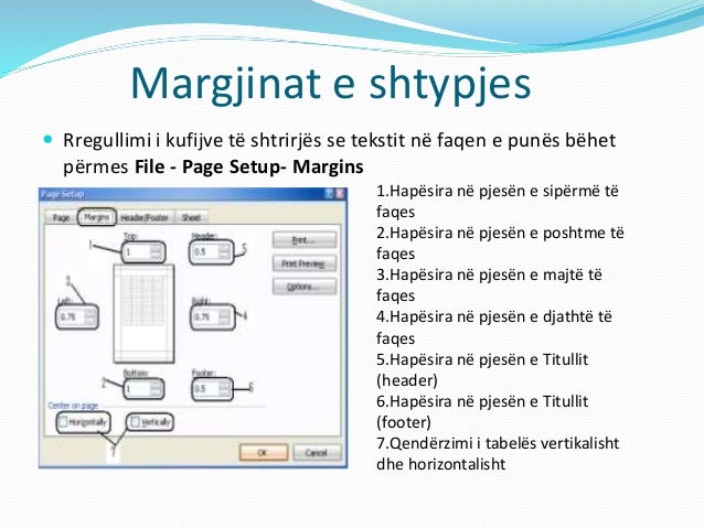 - 15. Margjinat e shtypjes Rregullimi i kufijve të shtrirjës se tekstit në faqen e punës bëhet përmes File - Page Setup- Margins 1.Hapësira në pjesën e sipërmë të faqes 2.Hapësira në pjesën e poshtme të faqes 3.Hapësira në pjesën e majtë të faqes 4.Hapësira në pjesën e djathtë të faqes 5.Hapësira në pjesën e Titullit (header) 6.Hapësira në pjesën e Titullit (footer) 7.Qendërzimi i tabelës vertikalisht dhe horizontalisht