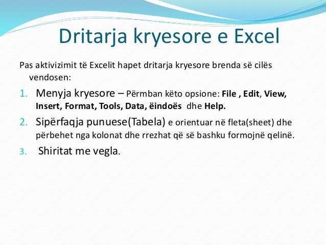 - 3. Dritarja kryesore e Excel Pas aktivizimit të Excelit hapet dritarja kryesore brenda së cilës vendosen: 1. Menyja kryesore – Përmban këto opsione: File , Edit, View, Insert, Format, Tools, Data, ëindoës dhe Help. 2. Sipërfaqja punuese(Tabela) e orientuar në fleta(sheet) dhe përbehet nga kolonat dhe rrezhat që së bashku formojnë qelinë. 3. Shiritat me vegla.