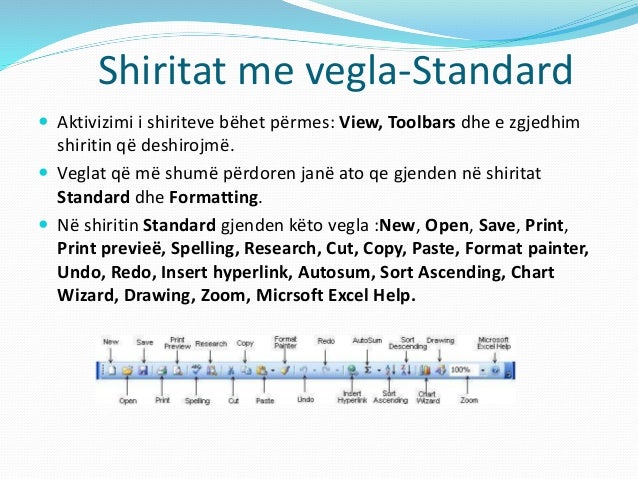 - 4. Shiritat me vegla-Standard Aktivizimi i shiriteve bëhet përmes: View, Toolbars dhe e zgjedhim shiritin që deshirojmë. Veglat që më shumë përdoren janë ato qe gjenden në shiritat Standard dhe Formatting. Në shiritin Standard gjenden këto vegla :New, Open, Save, Print, Print previeë, Spelling, Research, Cut, Copy, Paste, Format painter, Undo, Redo, Insert hyperlink, Autosum, Sort Ascending, Chart Wizard, Drawing, Zoom, Micrsoft Excel Help.