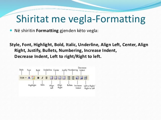 - 5. Shiritat me vegla-Formatting Në shiritin Formatting gjenden këto vegla: Style, Font, Highlight, Bold, Italic, Underline, Align Left, Center, Align Right, Justify, Bullets, Numbering, Increase Indent, Decrease Indent, Left to right/Right to left.