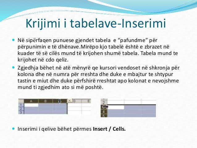 - 6. Krijimi i tabelave-Inserimi Në sipërfaqen punuese gjendet tabela e “pafundme” për përpunimin e të dhënave.Mirëpo kjo tabelë është e zbrazet në kuader të së cilës mund të krijohen shumë tabela. Tabela mund te krijohet në cdo qeliz. Zgjedhja bëhet në atë mënyrë qe kursori vendoset në shkronja për kolona dhe në numra për rreshta dhe duke e mbajtur te shtypur tastin e miut dhe duke përfshirë rreshtat apo kolonat e nevojshme mund ti zgjedhim ato si më poshtë. zgjedhja e kolonave zgjedhja e rreshtave Inserimi i qelive bëhet përmes Insert / Cells.