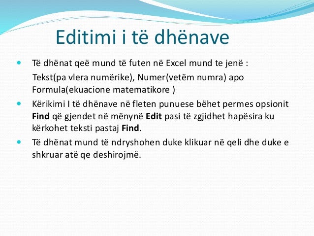 - 7. Editimi i të dhënave Të dhënat qeë mund të futen në Excel mund te jenë : Tekst(pa vlera numërike), Numer(vetëm numra) apo Formula(ekuacione matematikore ) Kërikimi I të dhënave në fleten punuese bëhet permes opsionit Find që gjendet në mënynë Edit pasi të zgjidhet hapësira ku kërkohet teksti pastaj Find. Të dhënat mund të ndryshohen duke klikuar në qeli dhe duke e shkruar atë qe deshirojmë.