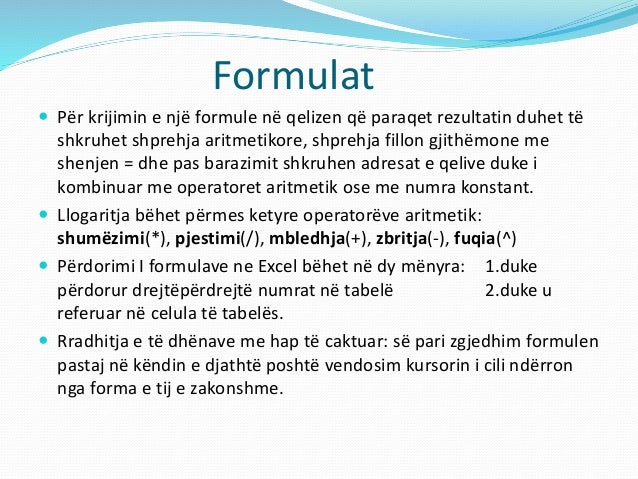 - 8. Formulat Për krijimin e një formule në qelizen që paraqet rezultatin duhet të shkruhet shprehja aritmetikore, shprehja fillon gjithëmone me shenjen = dhe pas barazimit shkruhen adresat e qelive duke i kombinuar me operatoret aritmetik ose me numra konstant. Llogaritja bëhet përmes ketyre operatorëve aritmetik: shumëzimi(*), pjestimi(/), mbledhja(+), zbritja(-), fuqia(^) Përdorimi I formulave ne Excel bëhet në dy mënyra: 1.duke përdorur drejtëpërdrejtë numrat në tabelë 2.duke u referuar në celula të tabelës. Rradhitja e të dhënave me hap të caktuar: së pari zgjedhim formulen pastaj në këndin e djathtë poshtë vendosim kursorin i cili ndërron nga forma e tij e zakonshme.